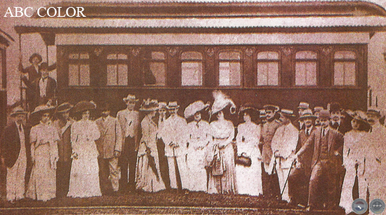 Inauguración del tramo de Paraguarí a Escobar, cuando la empresa ferroviaria era una de las más poderosas del país. Entre los que posan frente al vagón presidencial y rodeado de "emplumadas" damas se encuentran dos figuras del Gobierno y del Partido Liberal: Adolfo Riquelme -de blanco, en el medio- y el Cnel. Albino Jara, frente a la tercera ventanilla, desde la derecha de la imagen. Ambos serían protagonistas de trágicos sucesos un par de años más tarde.