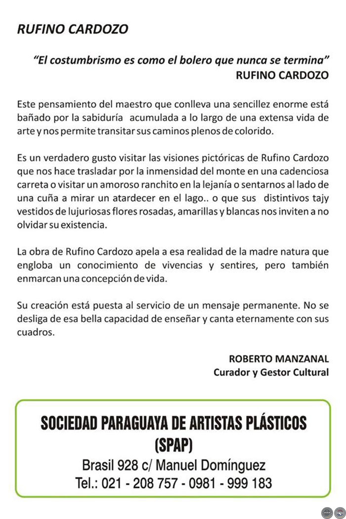 El jueves 28 de mayo se inauguró la muestra colectiva titulada “Pinceladas para mi Patria” de la Sociedad Paraguaya de Artistas Plásticos (SPAP) en el local de APA (Autores Paraguayos Asociados) sitio en Chile e/ Humaitá y Piribebuy. Dicha muestra tuvo como objetivo rendir un homenaje en vida al maestro Rufino Cardozo, músico y pintor de larga trayectoria nacional. En dicho evento pudo apreciarse una selección de obras del maestro y además una muestra colectiva de los integrantes actuales de la SPAP. El Maestro Rufino Cardozo recibió una placa de Reconocimiento de parte de la Sociedad Paraguaya de Artistas Plásticos por su trayectoria destacada en el arte. El texto de presentación de la muestra estuvo a cargo de Roberto Manzanal, curador y gestor cultural.