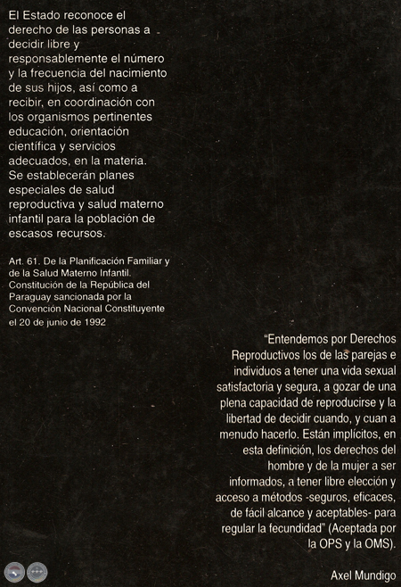 "Entendemos por Derechos Reproductivos los de las parejas e individuos a tener una vida sexual satisfactoria y segura, a gozar de una plena capacidad de reproducirse y la libertad de decidir cuándo, y cuan a menudo hacerlo. Están implícitos, en esta definición, los derechos del hombre y de la mujer a ser informados, a tener libre elección y acceso a métodos -seguros, eficaces, de fácil alcance y aceptables- para regular la fecundidad". En el trabajo se elabora la problemática de la mortalidad y morbilidad materna. Se analiza la situación del aborto en el país agravadas por las circunstancias de la clandestinidad; los abortos practicados en malas condiciones llevan a la muerte o la discapacidad a muchas mujeres, comprendiendo adolescentes y jóvenes. Ciertamente se trata de uno de los problemas más importante de salud pública.