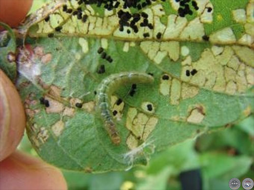 Larva de Omiodes rodeada de excrementos.