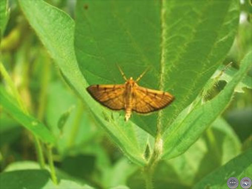 Durante este ciclo 2009-2010, la oruga enrolladora de hojas (Omiodes indicata), Lepidoptera: Pyralidae, ha causado daños considerables en el cultivo de soja por su difícil control. Considerada anteriormente plaga ocasional, tardía, con bajas poblaciones ha pasado desapercibida por varios años a los ojos del productor, técnicos e investigadores en nuestro país. Los daños ocasionados por esta pequeña oruga no han llegado al nivel de control en ninguna zona sojera hasta este ciclo donde el aumento ha sido considerable e importante sobre todo por las escasas informaciones acerca de su biología, ecología y control. Su nombre vulgar se debe al hábito de enrollar las hojas atacadas con hilos de seda para protegerse, observándose a las orugas rodeadas de excrementos. Las orugas de color verde raspan el parénquima foliar, quedando las hojas trasparentes que luego se secan. Según estudios realizados en el Brasil en ataques severos pueden reducir el área foliar y fotosintética en forma significativa. El quinto estadio es el más voraz de todo su ciclo larval.