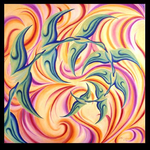Mercedes McLean’s work borders between abstract and figurative. Every inch is full of vivid colors that suggest animals and nature. In the world she imagines and paints, animals blend with water, air, flowers, and forest--all the elements of their environment-- to create a new and extraordinary shape on canvas. In this way, her work transitions from figurative to pure and simple abstraction.