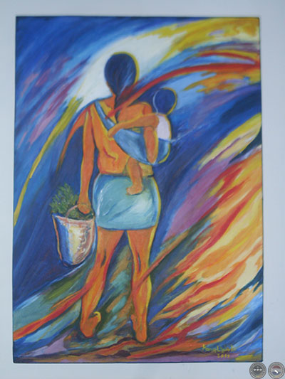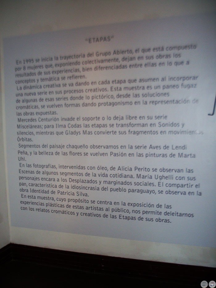 “Mercedes Centurión invade el soporte o lo deja libre en su serie Misceláneas; para Ilma Codas las etapas se transforman en Sonidos y silencios, mientras que Gladys Mas convierte sus fragmentos en movimientos Órbitas. Segmentos del paisaje chaqueño observamos en la serie Aves de Lendi Peña, y la belleza de las flores se vuelven Pasión en las pinturas de Marta Uhl. En las fotografías, intervenidas con óleo, de Alicia Perito se observan las Escenas de algunos segmentos de la vida cotidiana. María Ughelli con sus personajes encara a los Desplazados y marginados sociales. El compartir el pan, característica de la idiosincrasia del pueblo paraguayo, se observa en la obra Identidad de Patricia Silva”, detalló María Eugenia Ruíz, curadora de la muestra.