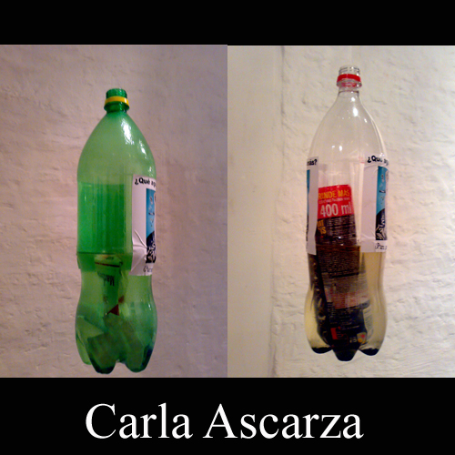 INTERVENCIÓN: Se compone de 9 botellas de plástico de diferentes gaseosas que se comercializan en nuestro mercado. Las mismas están cargadas con agua, que a su vez, tienen dentro ciertos materiales de desperdicios que muchas veces son arrojados por las personas a nuestros ríos y arroyos, como lo son las pilas, clavos, cables, latitas o botellas de gaseosas de empresas multinacionales; también se pueden observar vasitos de papel que hacen referencia a las grandes cadenas de comida chatarra, y tambien se encuentra una etiqueta de un insecticida que "mata todo", cucarachas, hormigas, arañas, moscas, etc.. Estos son desperdicios que llegan a nuestras aguas y que las contaminan de alguna u otra manera. Las botellas están etiquetadas con el diseño de la misma obra que se expone en la muestra.