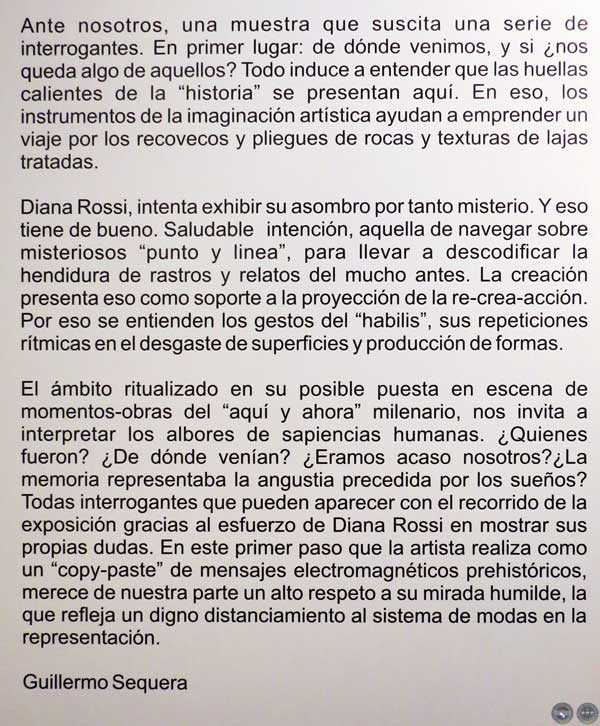 El ámbito ritualizado en su posible puesta en escena de momentos-obras del “aquí y ahora” milenario, nos invita a interpretar los albores de sapiencias humanas. ¿Quiénes fueron? ¿De dónde venían? ¿Éramos acaso nosotros? ¿La memoria representaba la angustia precedida por los sueños? Todas interrogantes que pueden aparecer con el recorrido de la exposición gracias al esfuerzo de Diana Rossi en mostrar sus propias dudas. En este primer paso que la artista realiza como un “copypaste” de mensajes electromagnéticos prehistóricos, merece de nuestra parte un alto respeto a su mirada humilde, la que refleja un digno distanciamiento al sistema de modas en la representación”.
