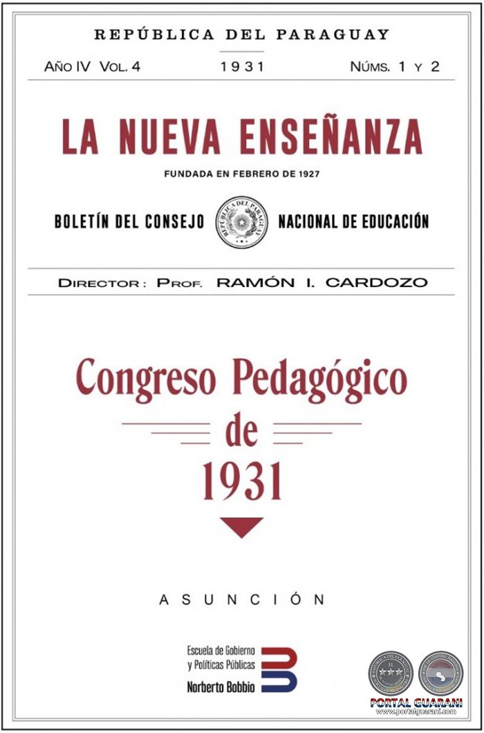 — ¿Qué fue el Congreso Pedagógico de 1931?— Del 8 al 17 de febrero de 1931 se realizó el segundo congreso pedagógico nacional. Fue una reunión de directores de escuelas, inspectores escolares y el magisterio, además de las autoridades educativas de la época, para analizar y definir el rumbo que debería adoptar la educación paraguaya. Los participantes fueron el entonces ministro de Justicia, Culto e Instrucción Pública, Justo P. Benítez; el director general de Escuelas y presidente del Consejo Nacional de Educación, Ramón Indalecio Cardozo, y varias figuras del magisterio de aquel momento, como la directora de la Escuela Normal de Profesores, María Felicidad González. El discurso de clausura estuvo a cargo del entonces miembro del Consejo Nacional de Educación, Anselmo Jover Peralta.