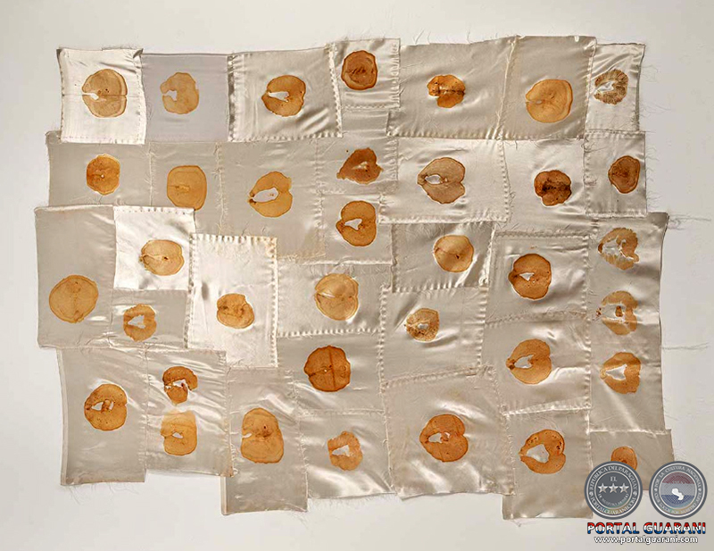 Los símbolos patrios son objeto de atención de Arnaldo Cristaldo desde hace tiempo. En un país de fuerte inclinación nacionalista, intervenir la bandera o el escudo resulta siempre transgresor. El artista trabaja la representación emblemática del Paraguay, descalzando discursos y sustituyendo materiales “nobles” como el algodón por elementos desechables como el plástico negro habitualmente utilizado en las bolsas de basura. La obra que presenta en el Malba consiste en un escudo bordado sobre tejido de ao po’i almidonado y posteriormente desbordado, “una especie de acción metafórica con relación al arrepentimiento y la desilusión”, según sus palabras. “El símbolo, al igual que el tejido y el bordado, son constructos. En ocasiones aquello que debía permanecer oculto emerge, generando quiebres, dejando cicatrices”, dice.