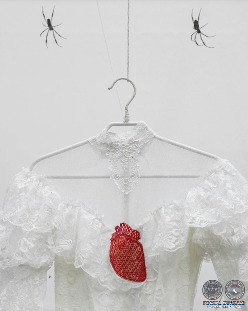 “Este corazón anatómico de encaje que Joaquín Sánchez pone sobre el vestido refiere a la historia del textil y de las mujeres en el Paraguay. Ñandutí quiere decir tela de araña y es por eso que están estas laboriosas arañas aquí”, explicaba Lia Colombino en su presentación curatorial. Sin embargo, y para desconcierto general del mundo del arte, las redes sociales se impusieron por encima de todo criterio racional, satanizando la obra con furia ingenua, pero muy revulsiva, condenando la inhumanidad del artista por utilizar animales vivos y obligando moralmente al museo a retirar las arañas de la obra.