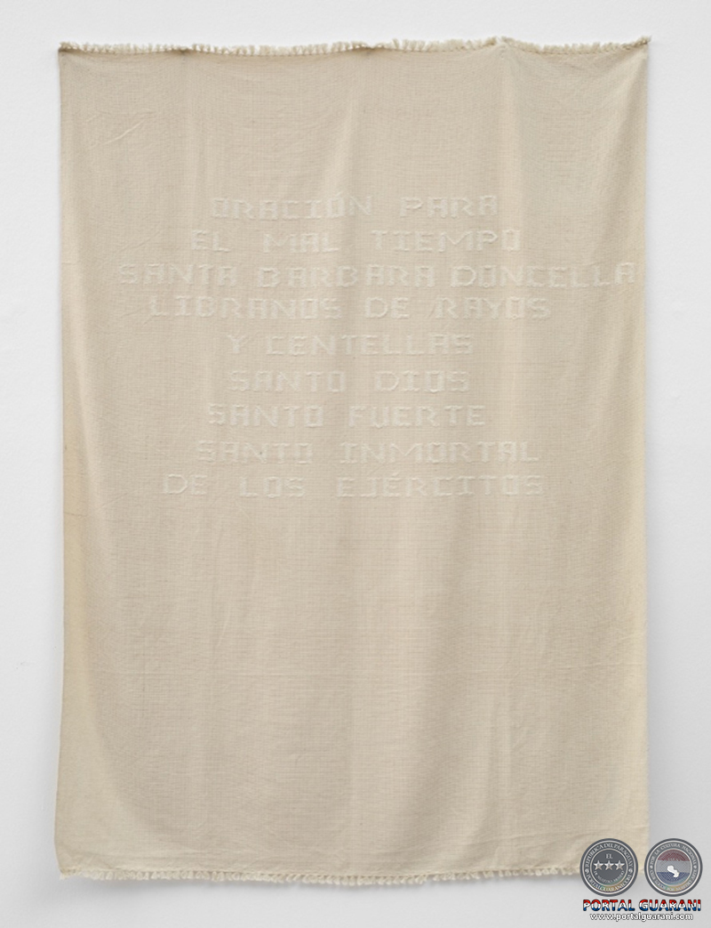Félix Cardozo presenta una típica manta de algodón tejida en telar artesanal (poyvi) sobre la que ha bordado una oración a Santa Bárbara contra el mal tiempo. Abrigo y protección, dos conceptos asociados desde antiguo a lo femenino. La obra es parte de un proyecto mayor de trabajo con mujeres campesinas, que incluyó la colecta de oraciones y el registro de entrevistas personales. La manta, cuya elaboración genera sustento económico en zonas rurales del Paraguay, remite al cuerpo. “Las palabras bordadas en la piel de algodón devienen tatuajes indelebles que resultan el medio más eficaz para recordar y elaborar lo que se ha vivido, lo que ha sucedido y no se desea olvidar”, dice el artista.