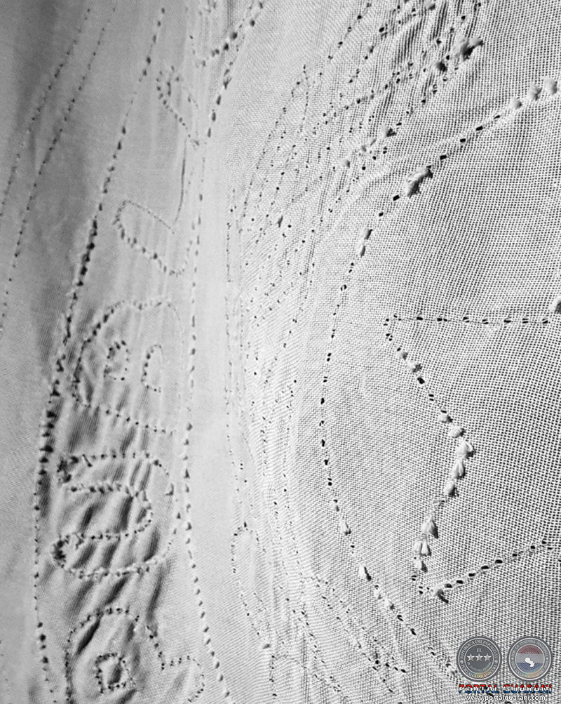 Karina Yaluk. De los ojos del aire y de los acontecimientos en el jardín nocturno, 2001. Fragmentos de satén con registros de agallas de peces. Cortesía MALBA