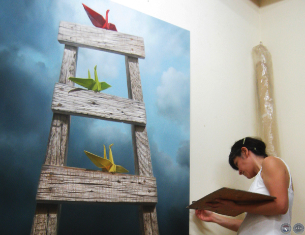 En esta inquietante serie de pinturas el óleo es relegado y domeñado a simple tamiz de las emociones y el significado; la artista no se permite subjetividades resignando la expresividad de la pincelada y el trazo, gesto que la reduce a apenas testigo de los fenómenos acaecidos en el tiempo y el espacio: una escalera, un enérgico tendido de alambres, una flor, residuos de mortero, tierra y polvo y cielo quejumbroso designan un momento de la memoria y los avatares de la vida cotidiana, en la que la sensibilidad de la artista recoge el eco y la vibración de las cosas que pasan y le pasan.