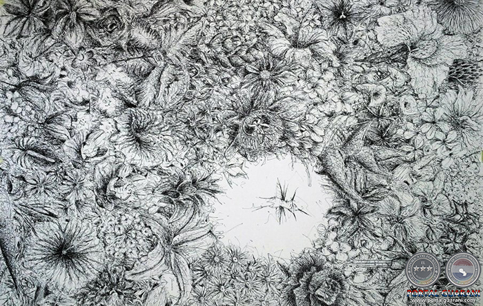 Baldivieso comenzó a exponer en el 2010 cuando Alfred Pajes, gran fotógrafo y cazador de artistas emergentes, lo invitó a exponer con Luis Laneri en el Centro Cultural Citibank. Cuenta que utiliza varias técnicas. Trabajó mucho con acuarela desde que vio a su profesora, la artista visual Cristina Paoli, pintando con una. Fue una de las cosas que más le impresionó en la universidad. “Solo que entonces yo no tenía la soltura que requería la acuarela, así que desarrollé la técnica más anclada en el realismo. Ya con la pluma y tinta, los logros fueron más inmediatos e intensos. Hoy, la tinta es la técnica que me define. Es más fácil encontrarme a mí en ella”, revela.