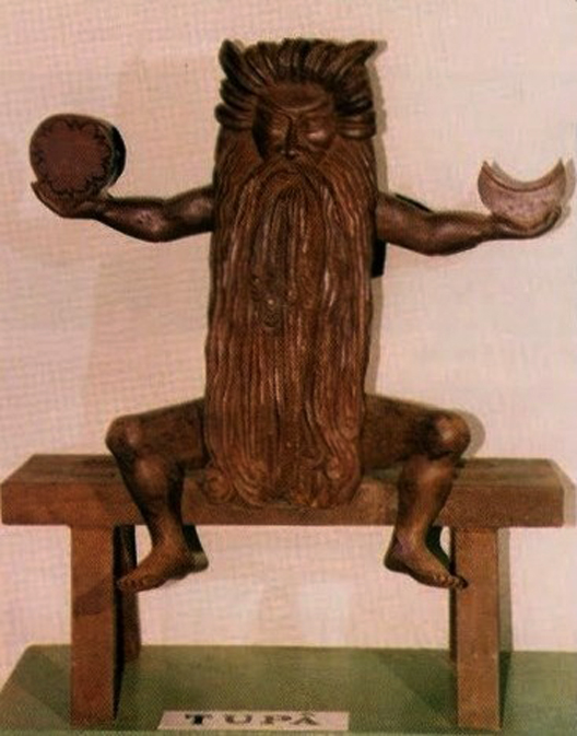 El dios Tupâ (llamado también Tupavé y Tenondeté), es la suprema divinidad de la raza guaraní (Escultura en madera en el Museo Mitológico Ramón Elías de la ciudad de Capiatá, Paraguay). Posee las mismas funciones que el dios Thor del norte de Europa.