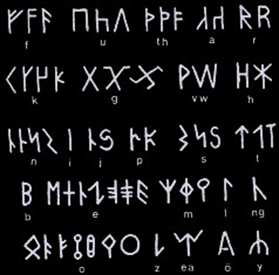 El Futhark sudamericano de acuerdo a Jacques de Mahieu, que comprende veinticinco letras. De Mahieu ha manifestado que la multiciplidad de formas de algunos de sus caracteres proviene de la influencia coincidente de los “alfabetos” rúnicos europeos, sea que el grabador haya elegido libremente entre ellas según su preferencia personal, o sea que circunstancia de tiempo y de lugar haya hecho predominar, en tal o cual región, las unas o las otras. Algunas de dichas formas no son, por lo demás, sino variaciones sin importancia (De la obra de Jacques de Mahieu, El rey vikingo del Paraguay, 1979).
