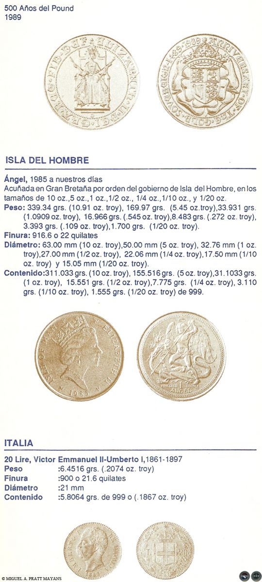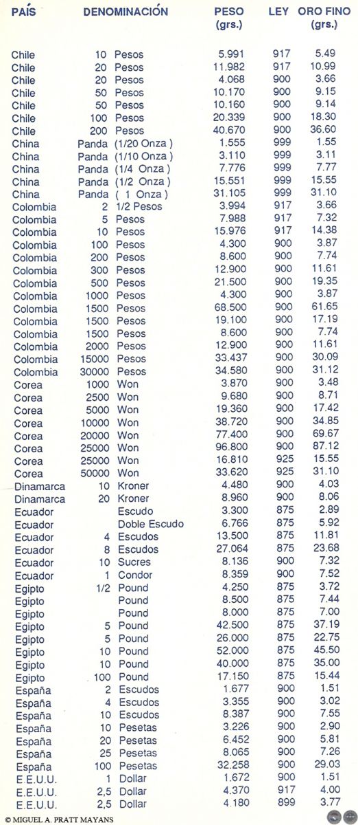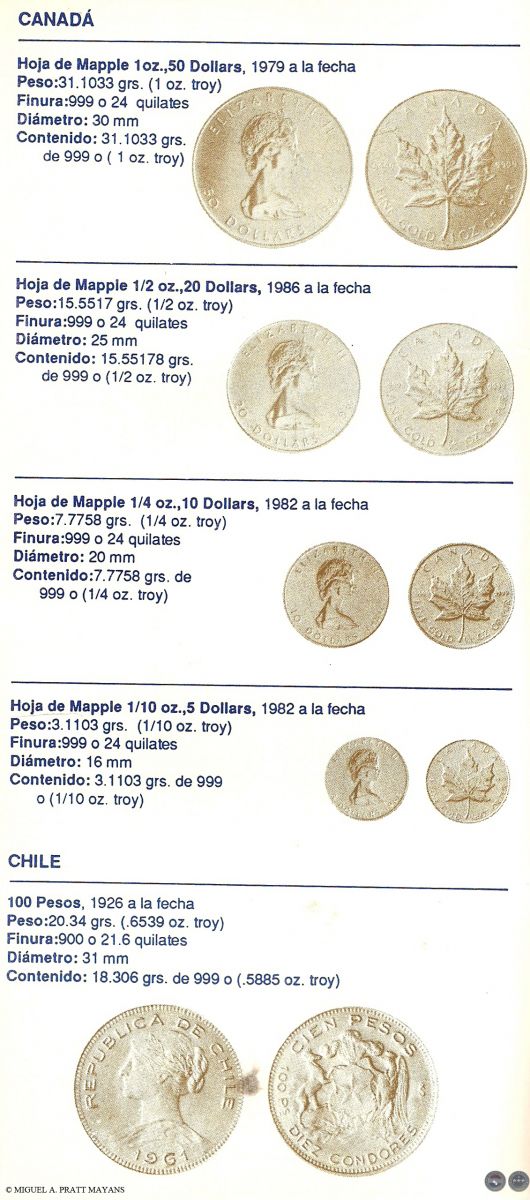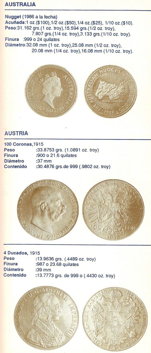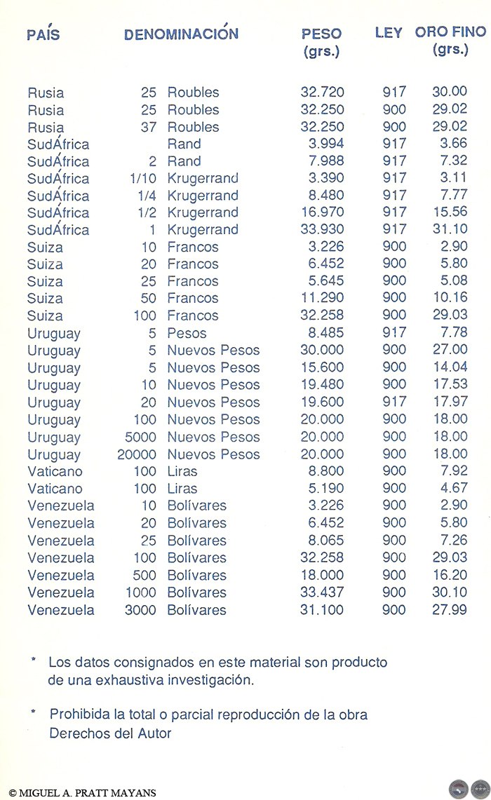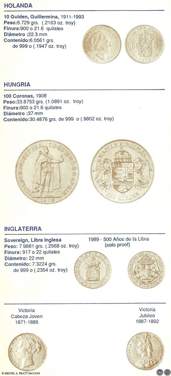 Algunos temas tratados: Lo que debe saber antes de comprar monedas para inversión, Estado de las Monedas, Finura del oro, Equivalencia de quilates en milésimas, Procedimiento usado para rebajar la ley del metal, Medidas de pesos utilizadas con los metales, Monedas de oro más usuales de Australia, Austria, Bélgica, Canadá, Chile, China, Colombia, Corea, EE.UU., Francia, Holanda, Hungría, Inglaterra, Isla del Hombre, Italia, México, Paraguay, Sudáfrica, Barra de Oro del Crédito Suizo y Otras Monedas de oro del mundo (La información incluye: denominación, peso, finura, diámetro, y contenido de oro fino en gramos y en onza troy).