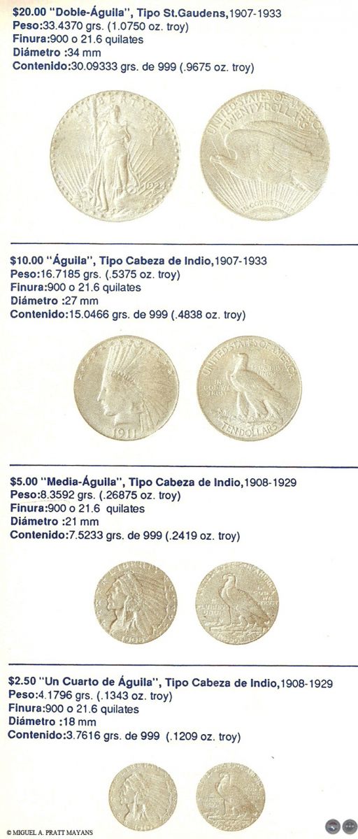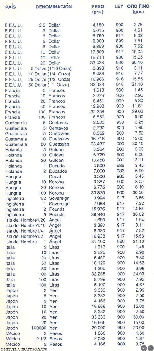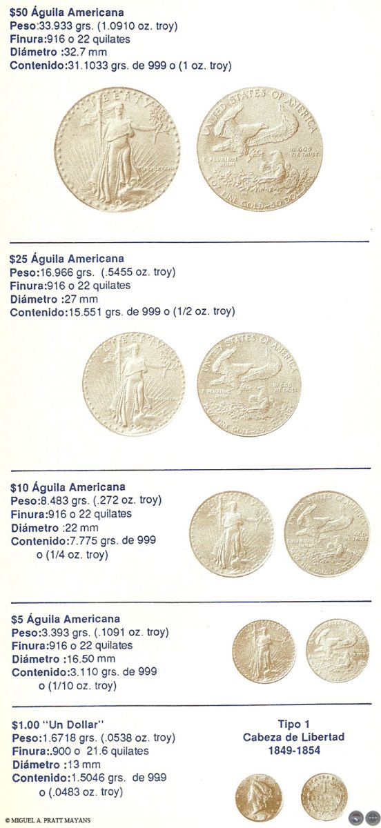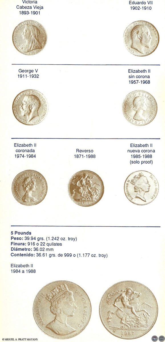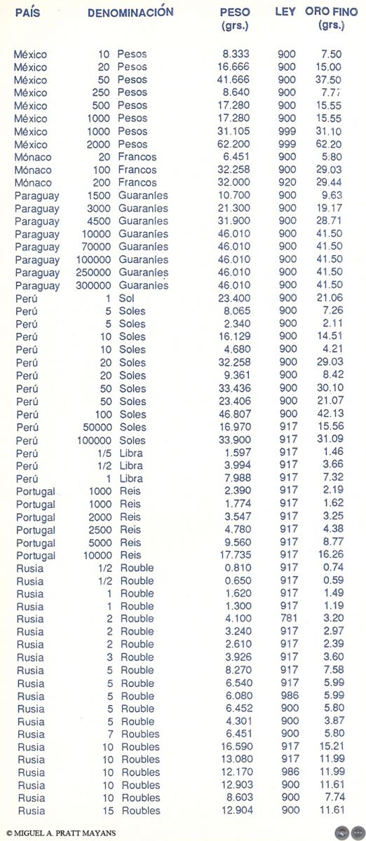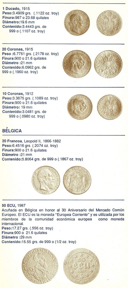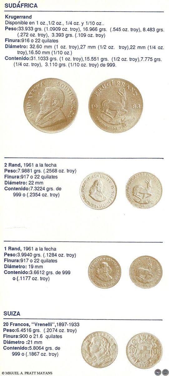 Algunos temas tratados: Lo que debe saber antes de comprar monedas para inversión, Estado de las Monedas, Finura del oro, Equivalencia de quilates en milésimas, Procedimiento usado para rebajar la ley del metal, Medidas de pesos utilizadas con los metales, Monedas de oro más usuales de Australia, Austria, Bélgica, Canadá, Chile, China, Colombia, Corea, EE.UU., Francia, Holanda, Hungría, Inglaterra, Isla del Hombre, Italia, México, Paraguay, Sudáfrica, Barra de Oro del Crédito Suizo y Otras Monedas de oro del mundo (La información incluye: denominación, peso, finura, diámetro, y contenido de oro fino en gramos y en onza troy).