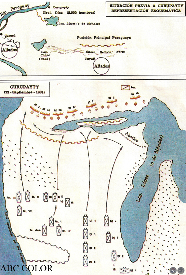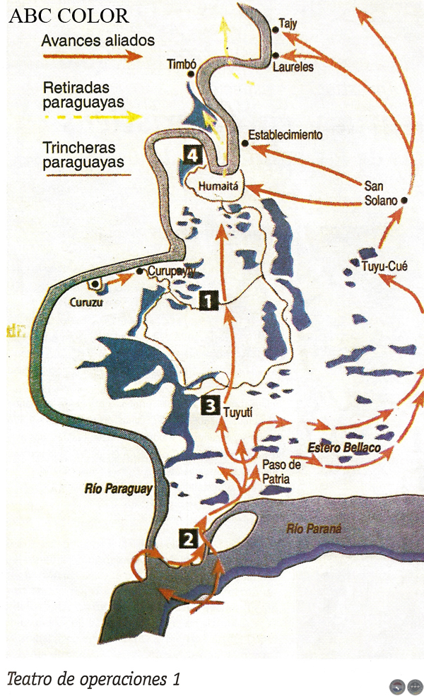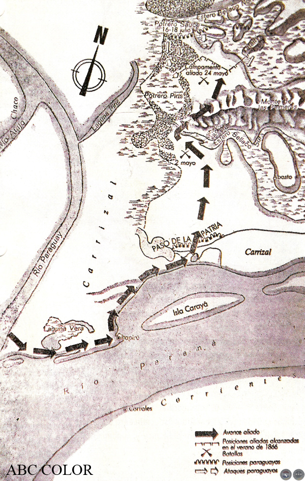 Al amanecer del 16 de abril de 1866, la guerra se instalaba en territorio paraguayo. La armada aliada con 17 naves de guerra y 92 bocas de fuego se desplegaba sobre la orilla derecha del Paraná para proteger la línea de desembarco, un poco más arriba de Itapirú, sobre la costa del río Paraguay en el sitio conocido como Laguna Sirena.
