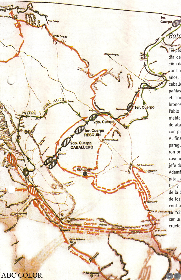 Toda esa larga línea artillada con ocho cañones de 68, protegía las posiciones paraguayas. Detrás, tomaron posición los batallones de infantería 4, 7, 9, 27, 36, 38 y el 40, comandados, respectivamente, por los capitanes: Antonio Insaurralde, Bernardo Olmedo, Juan Fernández y José Ascurra; los Cdtes. Antonio Luis González y Juan González. A cargo del famoso Batallón N° 40, estaba el mayor José Duarte.