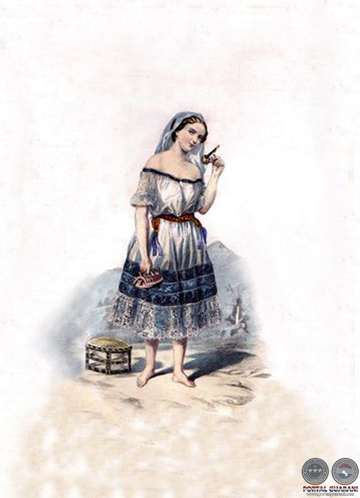En la página anterior, Muchacha paraguaya fumando (grabado de D' Hastrell, mediados del siglo XIX). En esta página,