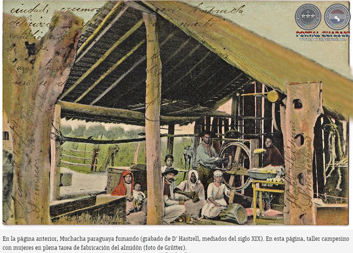 taller campesino con mujeres en plena tarea de fabricación del almidón (foto de Grûtter).