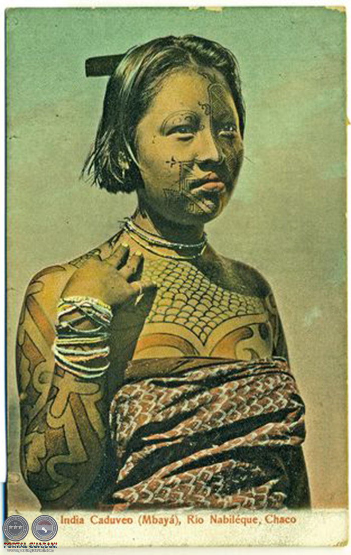 India caduveo (mbaya), en Río Nabiléque, Chaco, lleva el cuerpo pintado y algo de vestimenta.