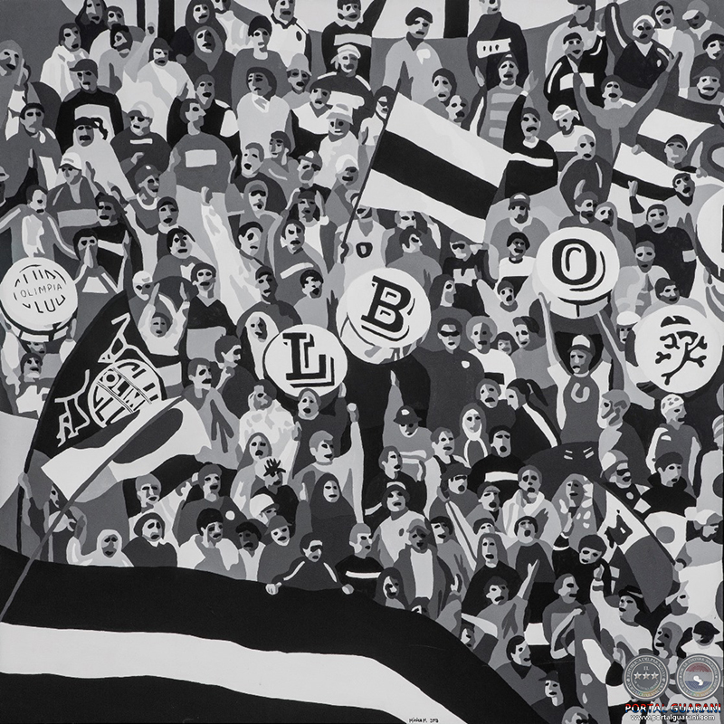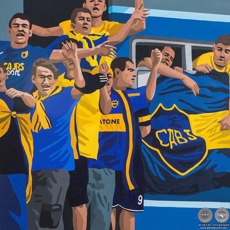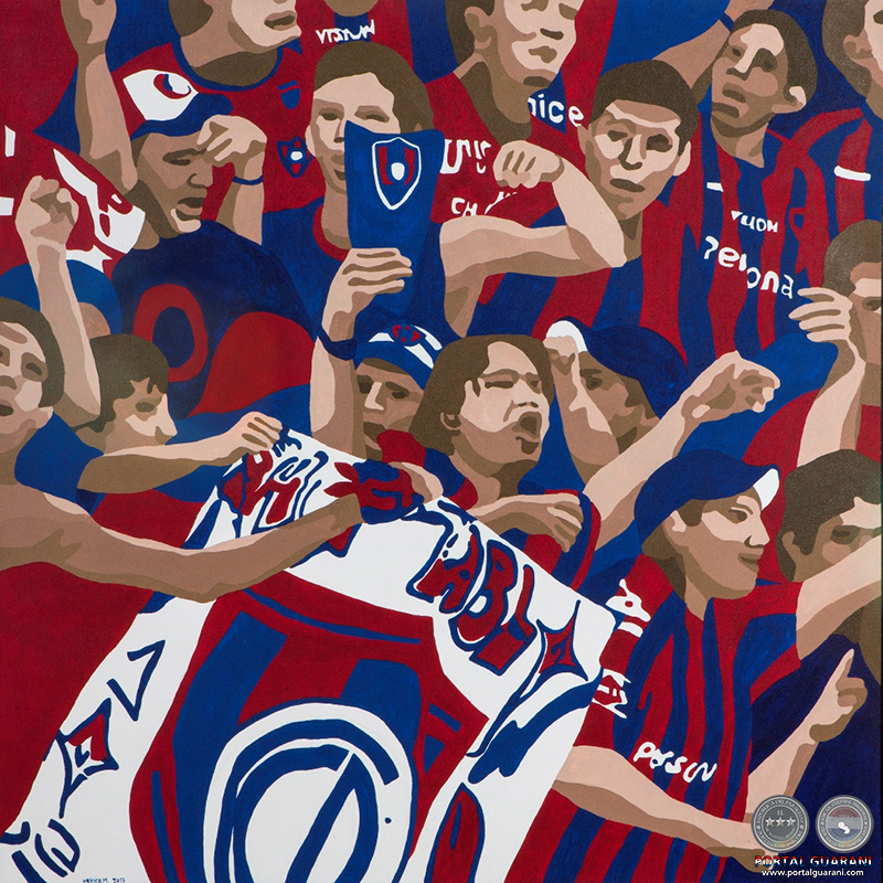 …Ahora bien, la obra de Mónica, muy original en cuanto al tema, muestra su gran conocimiento, no sólo de la pintura, sino también de la fotografía, ella se ha dedicado mucho tiempo a esa actividad y – en este caso- se ha aprovechado de ella para la confección de sus cuadros. En efecto, a simple vista podemos darnos cuenta que, esta técnica realizada sobre tela al acrílico, revela una visión fotográfica coadyuvante a la pintura y que crea una atmósfera muy peculiar de las figuras como un “flash” fotográfico. La imagen ha sido congelada, y hay un énfasis en los gestos y actividades: tanto de la hinchada como de los futbolistas, en otras palabras, la obra es procesual, y no una copia directa de la realidad. Está mediatizada por la cámara.”