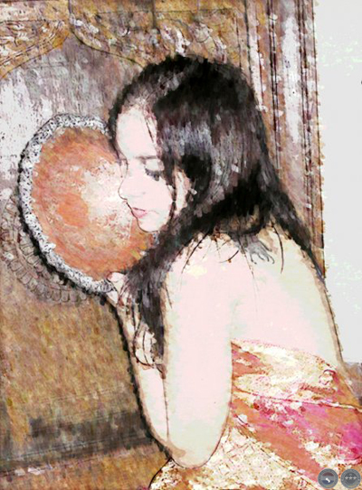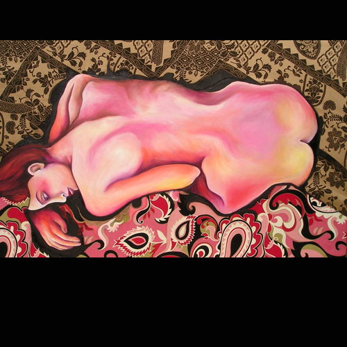 Románticas, exóticas, delicadas mujeres nos invaden con su encanto divino, evocando un mundo femenino fascinante lleno de misterios. En cada obra utilizo el decorativismo ornamental, inspirándome en formas arabescas e hindúes, diseños de telas, papeles, estampas, mosaicos y flores. El estilo sigue una línea decorativa que se complementa con las figuras centrales y estilizadas, donde la luz centelleante penetra en los cuerpos con pinceladas.