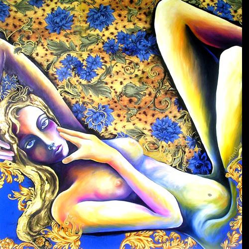 Románticas, exóticas, delicadas mujeres nos invaden con su encanto divino, evocando un mundo femenino fascinante lleno de misterios. En cada obra utilizo el decorativismo ornamental, inspirándome en formas arabescas e hindúes, diseños de telas, papeles, estampas, mosaicos y flores. El estilo sigue una línea decorativa que se complementa con las figuras centrales y estilizadas, donde la luz centelleante penetra en los cuerpos con pinceladas.