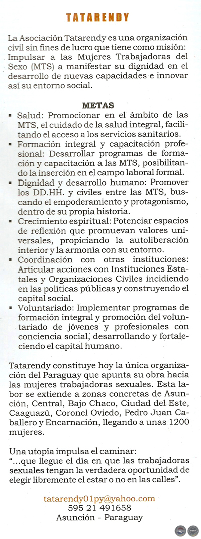 La Asociación Tatarendy es una organización civil sin fines de lucro que tiene como misión: Impulsar a las Mujeres Trabajadoras del Sexo (MTS) a manifestar su dignidad en el desarrollo de nuevas capacidades e innovar así su entorno social.