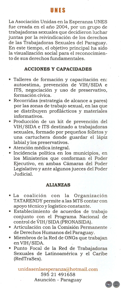 La Asociación Unidas en la Esperanza UNES fue creada en el año 2004, por un grupo de trabajadoras sexuales que decidieron luchar juntas por la reivindicación de los derechos de las Trabajadoras Sexuales del Paraguay. En este tiempo, el objetivo principal ha sido la visualización social para el reconocimiento de sus derechos fundamentales.