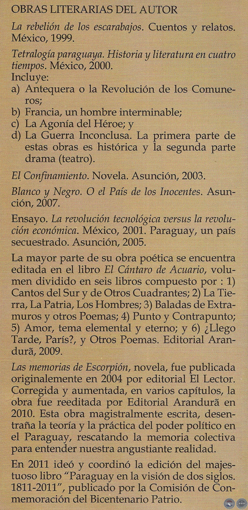 Y tal vez por la impía actitud del policía, el oficial de guardia, en este caso, y por ser la obra producto de una elucubración poética, y muy personal, nunca jamás me devolvieron el manuscrito original secuestrado. Solamente se me quedaron grabadas en la mente algunas frases, las que, mal hilvanadas en su fase de primer "borrador", con el tiempo las reconstruí y ellas me sirvieron para usarlas como colofón del cuento titulado "Añareta-i, o El pequeño país del Diablo", publicado en el libro "La Rebelión de los Escarabajos - Cuentos y Relatos", editado en México en el mes de abril de 2011, y por iniciativa de la Editorial Archipiélago.
