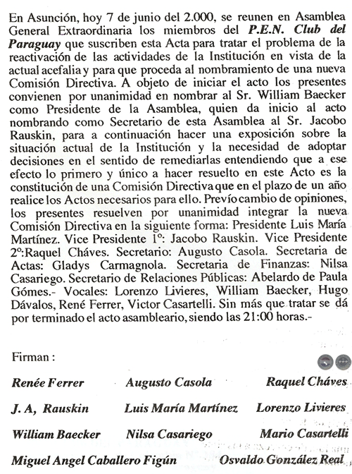 El PEN CLUB del Paraguay ofrece el aspecto de un vasto ateneo abierto. Pues allí se discute, se expone, se medita o se razona, o simplemente se deja que flote o vuele el aire incesante de los comentarios o el fluir de las aguas del murmullo poético. Todo sobre el porfiado terreno de la libertad.