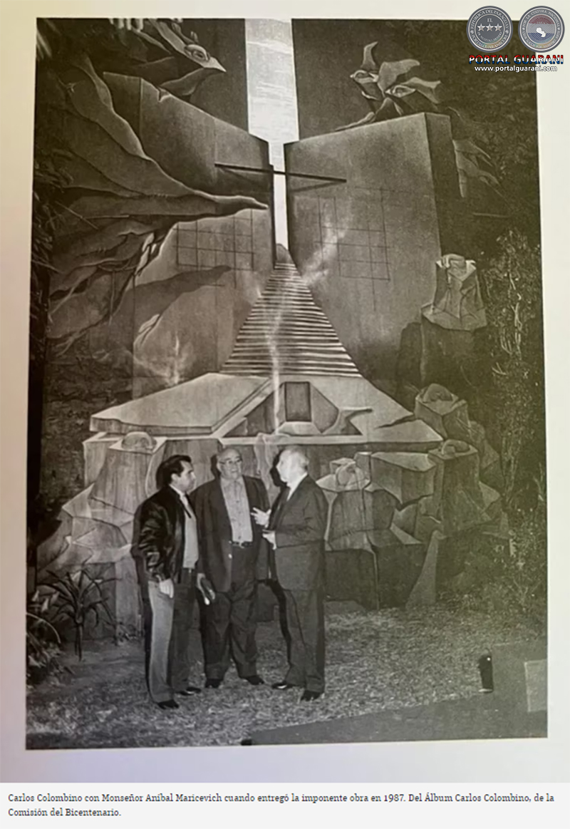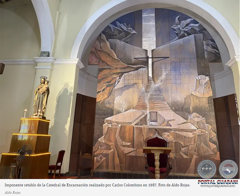 Ese mismo año de 1987 fue muy significativo para Colombino y para la población concepcionera. Al respecto, Ticio Escobar –destacado trabajador de la cultura y crítico de arte– recuerda que Carlos Colombino fue operado de la cadera en 1986, en Montevideo, y prometió a monseñor Aníbal Maricevich, obispo de Concepción, que le haría una obra para el altar de la catedral esa ciudad. “Cumplió su promesa: al año siguiente realizó una obra de nueve metros de alto por seis metros de ancho basándose en la figura de la Resurrección de Cristo. Donó la obra a la ciudad, su ciudad natal. La obra fue expuesta en la Galería Arte-Sanos antes de ser llevada a Concepción. Fue levantada en el jardín, pues no podría entrar en ninguna habitación cerrada. Esto es lo que yo recuerdo”, refiere ante nuestra consulta sobre la imponente obra.