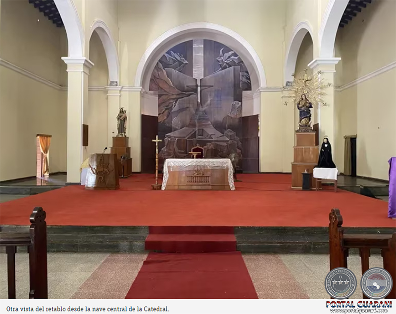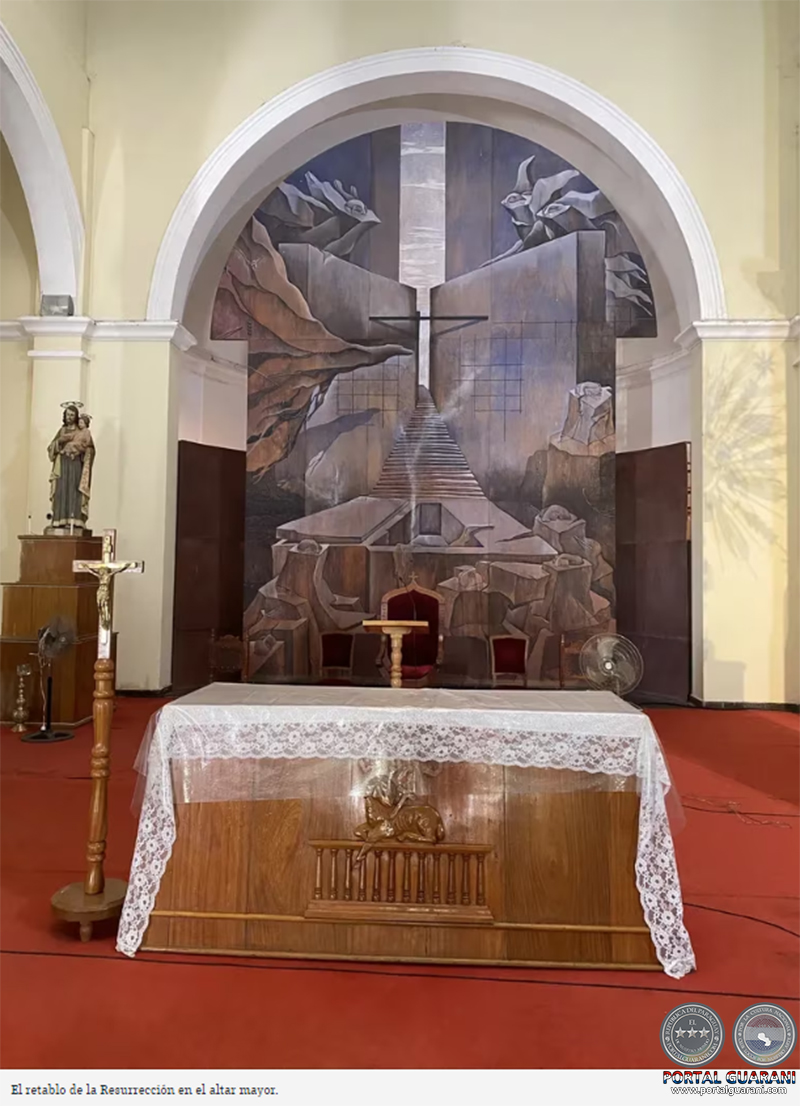 Una imponente obra de arte de Carlos Colombino representa el momento después de la resurrección de Nuestro Señor Jesucristo en el altar mayor de la Catedral de Concepción. Digna de admiración, la xilopintura fue realizada por el artista concepcionero en cumplimiento de una promesa.