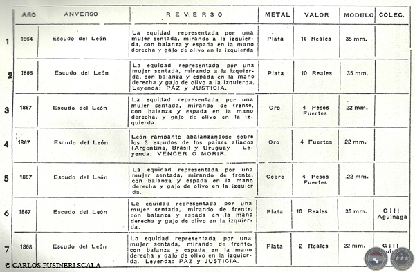 Habla también de que todas ellas son dentadas. En varias colecciones paraguayas se conservan monedas cortadas o fragmentadas, que estamos seguros que han circulado en los campamentos aliados y lo mismo entre los paraguayos, y no son dentadas.