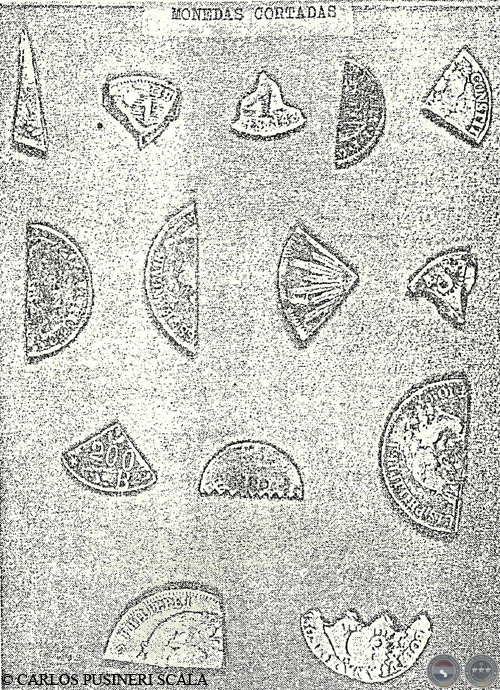Por lo tanto, no fue recién durante la guerra que se adoptó ese sistema de cortar moneda, como dan a entender algunos numismáticos. En el Paraguay corrieron estos fragmentos de monedas hasta después de la guerra.