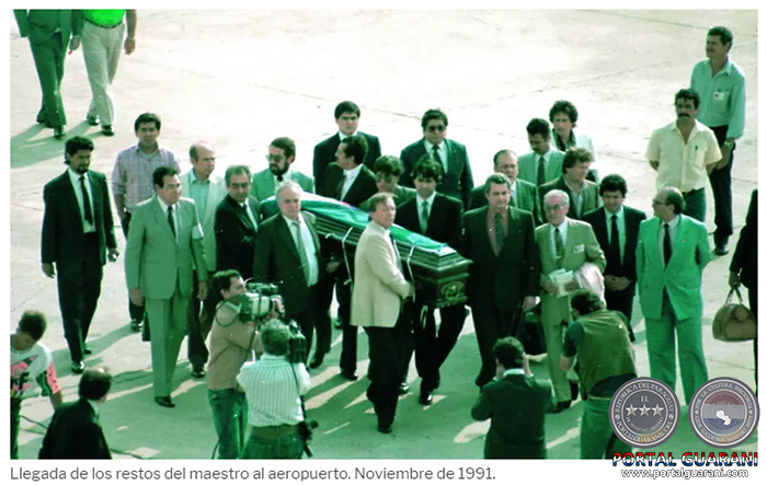 El recibimiento en el aeropuerto internacional de Luque fue multitudinario. Y desde ése sitio una larga caravana que seguía al coche de la funeraria que portaba los restos del excepcional creador recorrieron las principales avenidas, siendo saludado por estudiantes y transeúntes.