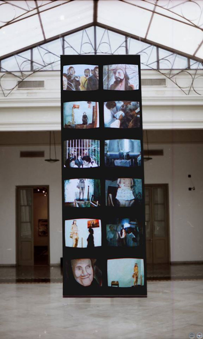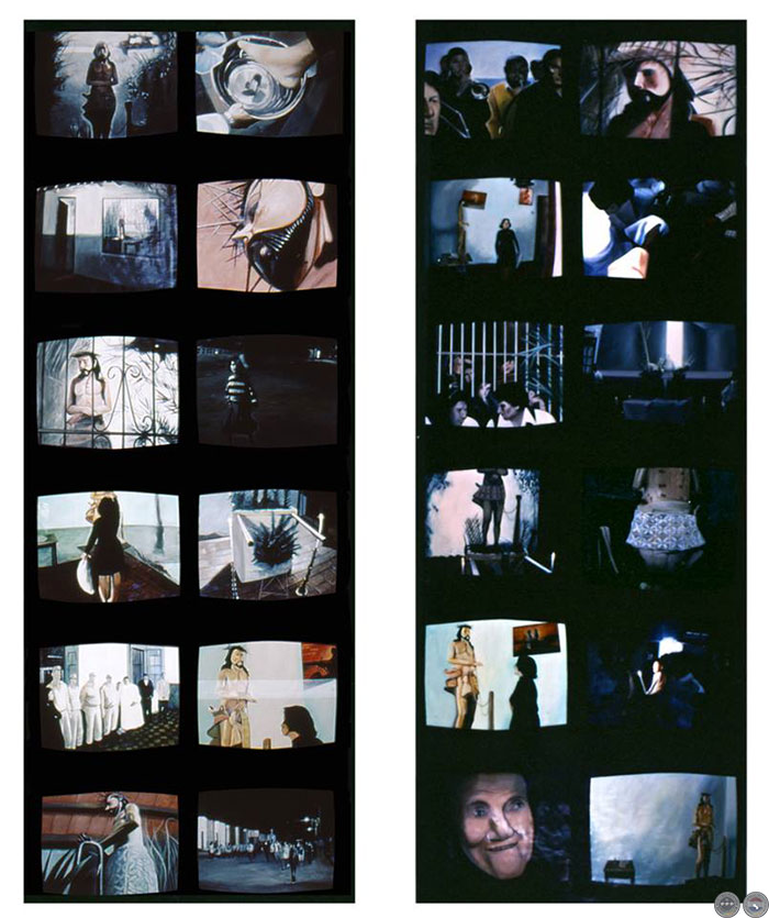 El resultado: 12 monitores de tele en cada lado del papel. La calidad visual; cinta VHS-C capturado por celuloide 35 mm. La intención fue reproducir esa textura visual que estos dos soportes producen al ser combinados a través del monitor de TV. El medio a reproducir debió ser pintura acrílica, por el secado rápido y la flexibilidad que caracteriza a este material.