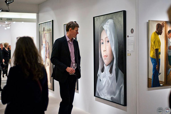 Friso Lammertse is conservator en samensteller van de nu al veel geroemde tentoonstelling ‘De weg naar Van Eyck’ in Museum Boijmans van Beuningen in Rotterdam. Hij heeft voor de bezoekers van PAN Amsterdam 2012 een selectie gemaakt van hier te koop aangeboden objecten waar hij de invloed van Jan van Eyck (circa 1400 – 1441) in ziet. Het gaat hierbij uitdrukkelijk niet alleen om oude kunst, vandaar de naam ‘De weg nà Van Eyck’.Van Eyck’s weergave van het licht en de effecten ervan op de zichtbare wereld betekenen een fundamentele vernieuwing in de kunst. Als eerste slaagde hij erin om de tastbare werkelijkheid overtuigend op te roepen. Het meest sprekend is misschien wel de manier waarop hij de optische effecten van glimmend materiaal op sublieme wijze wist te imiteren. Ook de huid van personen werden hyperrealistisch afgebeeld door Van Eyck, kraaienpootjes rond de ogen, haren op de kin, geen detail ontging hem.Het hyperrealistische portret door Enrique Collar van het gezicht van het meisje is haast tastbaar, elk moedervlekje schijnt te zijn weer gegeven.. De manier waarop het licht weerkaatst op het nylon trainingsjasje, maar vooral de lichtweerkaatsing in de ogen brengen de persoon tot leven. Deze lichtweerkaatsing, de witte puntjes in de ogen, werd voor het eerst in de schilderkunst geïntroduceerd door Jan van Eyck. Met dit op zich eenvoudige middel kregen de personen een levendigheid die daarvoor ondenkbaar was geweest.