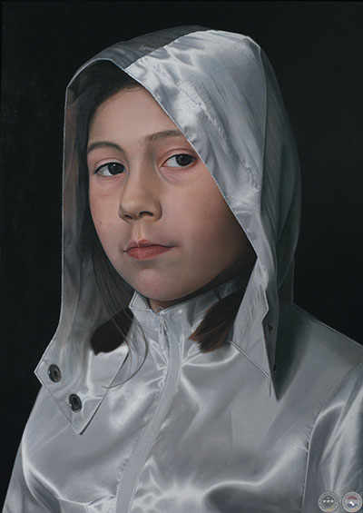 El retrato hiperrealista por Enrique Collar de la cara de la niña es casi tangible, cada uno parece mostrarse. lunar. La forma en la luz rebota en la chaqueta de entrenamiento de nylon, pero especialmente el brillo en los ojos dar vida a la persona. Esta reflexión de la luz, los puntos blancos en los ojos, se introdujo en la pintura de Jan van Eyck. Con este simple significa que las personas tienen una vivacidad había sido impensable. Traducido por Bing