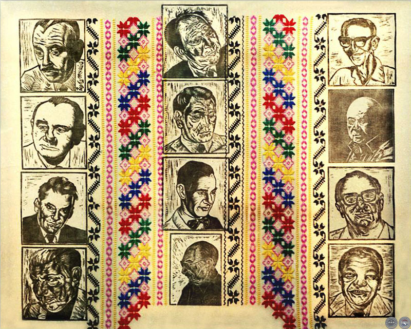 Mi paso por la Xilografía ha sido muy breve. Me entusiasmé con el lenguaje cuando comenzaba a pintar "PEREGRINOS". Unos 10 grabados más 2 de gran formato: Riña de Gallos y Cristo en la Comisaría. Y este último a pedido del Dr. Carlos Federico Abente, para ilustrar un libro suyo en Guaraní, donde publicó poesías dedicadas a sus grandes amigos de la Cultura Paraguaya, quienes como yo tuvieron el privilegio de compartir su afecto, humanidad y su mesa en su casa de Vicente López, Buenos Aires. Tenía en mi taller una tela de Ao'poí sin confeccionar, y me pareció que era el soporte más genuino para juntar en un retrato colectivo a los doce amigos de Don Carlos.