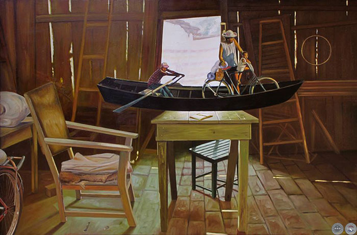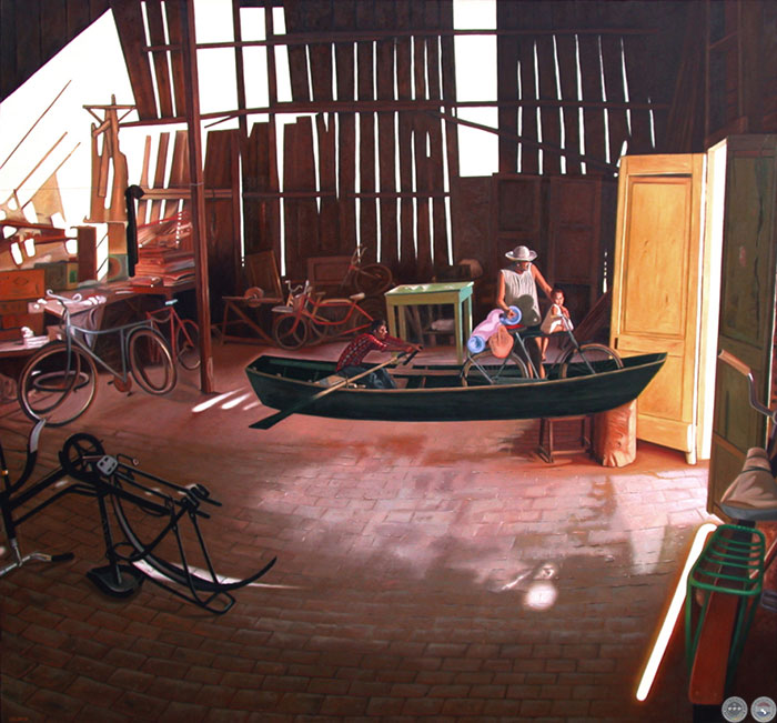 Recibí de Carlos Bittar la fotografía de esta pintura que se encuentra en Asunción. Años que no tenía una buena imagen de la obra. Lo primero que me viene a la memoria es la entrevista que tuve con un galerista de Chicago. Fui International Visitor de USA en 1998, a través de una beca que me otorgó la USIA por mi trabajo (agencia cultural de los Estados Unidos). Y entre las seis ciudades que visité había elegido Chicago, donde también me conectaron con esta galería, como parte de la Beca. Al hombre le interesó mi trabajo, pero no consideraba el conjunto de mi obra con el perfil de lo que la galería exponía. Al echar un vistazo a mi alrededor me fui dando cuenta de lo que me explicaba. Y tenía que ver con el “hit”, digamos. Sí, esas imágenes con éxito comercial, y que algunos artistas pueden repetir o variarlo hasta el cansancio. La diferencia con mi forma de trabajo lo confirmaban las paredes de las salas. El hombre concluyó diciéndome; “Si pintaras treinta obras con variaciones de esta pintura, te confirmo una exposición ya”. Me fui del lugar hacia otra entrevista marcada con un artista, tratando de olvidar el posible “Disco de Oro” que me habían propuesto ganar con esta tabla inspirada en una declaración que había hecho la escritora cubana Zoé Valdés sobre los sentimientos del exilio.