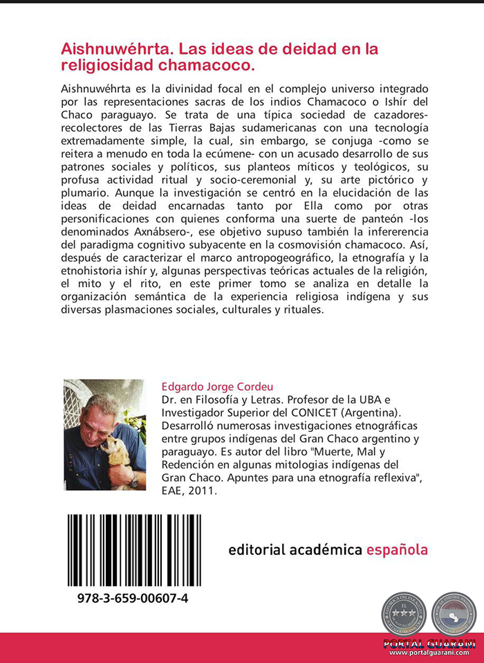 Aishnuwéhrta es la divinidad focal en el complejo universo integrado por las representaciones sacras de los indios Chamacoco o Ishír del Chaco paraguayo. Se trata de una típica sociedad de cazadores-recolectores de las Tierras Bajas sudamericanas con una tecnología extremadamente simple, la cual, sin embargo, se conjuga -como se reitera a menudo en toda la ecúmene- con un acusado desarrollo de sus patrones sociales y políticos, sus planteos míticos y teológicos, su profusa actividad ritual y socio-ceremonial y, su arte pictórico y plumario. Aunque la investigación se centró en la elucidación de las ideas de deidad encarnadas tanto por Ella como por otras personificaciones con quienes conforma una suerte de panteón -los denominados Axnábsero-, ese objetivo supuso también la infererencia del paradigma cognitivo subyacente en la cosmovisión chamacoco. Así, después de caracterizar el marco antropogeográfico, la etnografía y la etnohistoria ishír y, algunas perspectivas teóricas actuales de la religión, el mito y el rito, en este primer tomo se analizan en detalle la organización semántica de la experiencia religiosa indígena y sus diversas plasmaciones sociales, culturales y rituales.