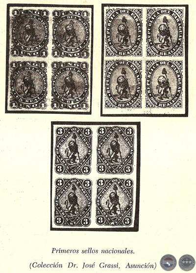 Refiere Phillips que hacia 1860 fue sometido al Presidente López un ensayo, destinado al primer sello adhesivo paraguayo, sin mencionar su procedencia. Afirma que en 1869, al ser ocupada Asunción, fue capturado entre otras cosas el molde de dicho ensayo, mediante el cual fueron hechas numerosas reproducciones en Buenos Aires, hacia 1870 (Obra cit., p. 6).