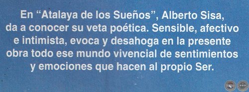 “ATALAYA DE LOS SUEÑOS”, resume la cosmovisión mía de las percepciones diarias, que se ven reflejadas en nuestras propias emociones. Aquellas que se tangibilizan con nuestros sentidos, y que se traducen en vivencias trasladadas a la acción de la palabra, a esa puerta dimensional poblada de magias y ensueños, - y porque no- realidades con nuestro mundo, nuestra sociedad y la Patria. Como decía Camus, “estamos en medio de una belleza de la que no podemos prescindir y de una sociedad de la que no podemos apartamos”.