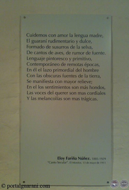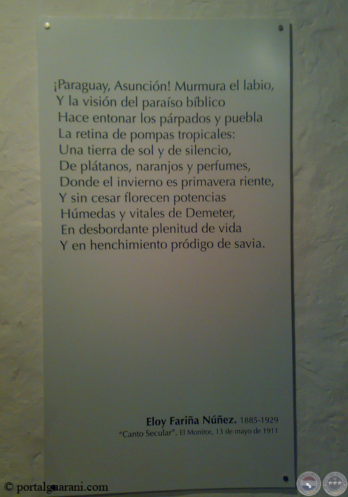 La paredes se engalanan cubiertas con los poemas que he elegido del gran poeta olvidado Eloy Fariña Núñez (1885-1929) inconmensurable como los 400 versos libres a la Patria en su “Canto Secular”; cantó al Paraguay como ningún otro poeta lo haya hecho hasta hoy a cien años de haberlo escrito (1911) y sigue siendo tan actual como entonces.