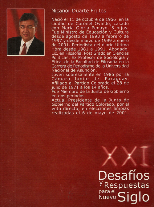 Ha de ser esa la lógica que encarna Nicanor Duarte Frutos para plantear al Partido Colorado y al Paraguay de hoy los Desafíos y las res puestas para el nuevo siglo. Esa lógica se instala en el pensamiento político y resuelve ese ya largo vaciamiento de las ideas en la sociedad política.