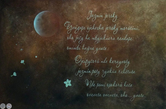 Como símbolo de esta hermandad, se incluyó el idioma guaraní en el título de la muestra, iniciativa de los artistas peruanos. Las pinturas más recientes de Surichaqui muestran una marcada obsesión por recrear la realidad con una técnica exigente y a la vez exhaustiva, con rigor en el dibujo y el uso del color y el valor, dando como resultado una obra sorprendente; mientras que en las obras de Soledad Tomairo Gabriel puede verse reflejada la nostalgia por la obra de los grandes genios del pasado. Combina personajes de la pintura antigua con elementos diversos y característicos de nuestra época para darle un carácter lúdico a sus composiciones.