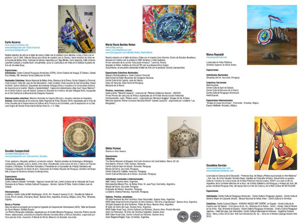Con las gestiones y total apoyo de la Dirección de Cultura del Ministerio de Relaciones Exteriores, las obras de la 9 artistas nacionales, Osvaldo Camperchioli, Liliana Segovia, Martín Vallejos, Carla Ascarza, Osvaldina Sevián, Noel Herzog, Ofelia Fisman, Marta Rocío Benítez y Marco Reynaldi, se exhiben actualmente en la Embajada del Paraguay en Montevideo.