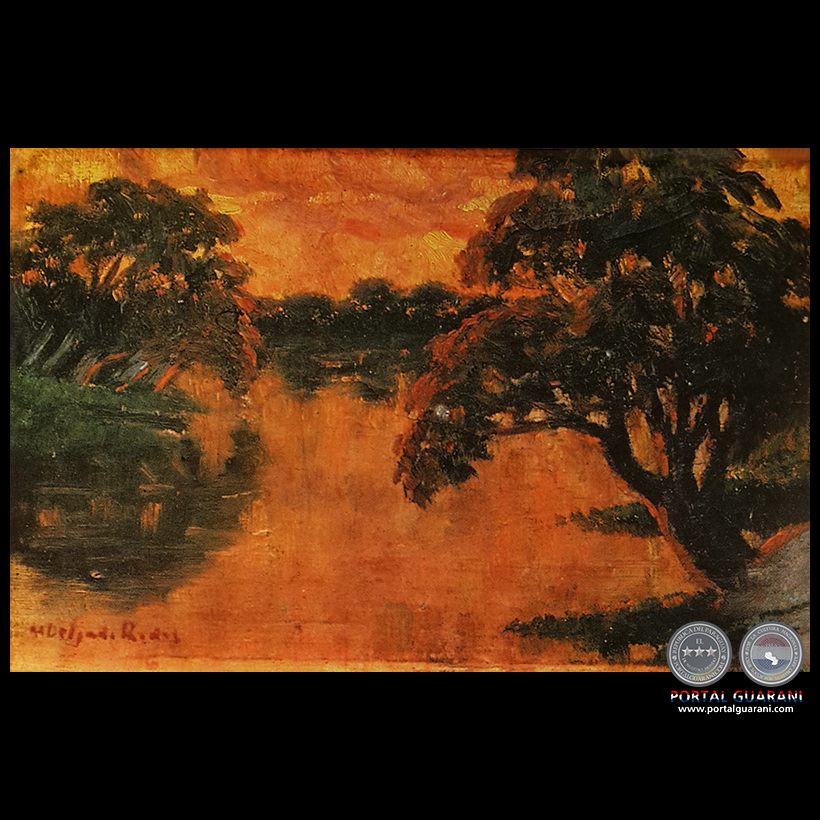 El río y el cielo se funden en una intensa calidez cromática, contrastada por el horizonte y los árboles a cada uno de los lados, que abrazan y contienen todo el centro del cuadro, el cual se convierte en un espacio de silencio, sumamente apacible. En esta pintura, el paisaje se vuelve casi un espacio interior.